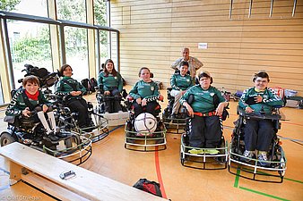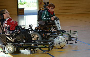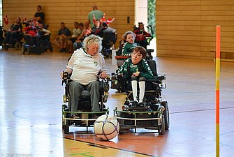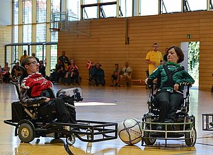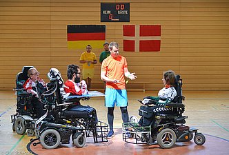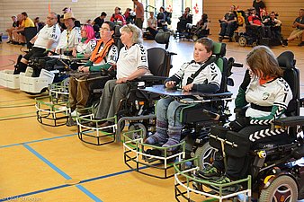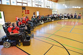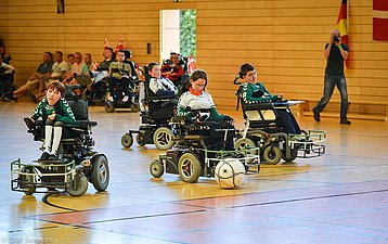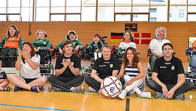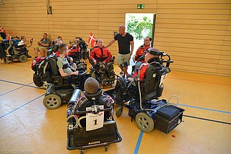 Als um 10 Uhr die ersten Spieler zum 1. Deutschen E-Rolli-Fußball-Turnier eintrafen, waren die Vorbereitungen in vollem Gange. Jede Mannschaft versammelte sich in ihrem Team-Areal. Um 11 Uhr zogen nacheinander die Mannschaften in die Halle ein. Zuerst die Dänen mit der weitesten Anreise, danach die Knights aus Barmstedt und zuletzt die Power Lions und Power Cats des SV Motor Mickten-Dresden. Vorher brachte der Moderator Stefan Bräuer das Publikum so richtig in Stimmung. Danach begann die offizielle Begrüßung mit Vertretern des Sports und der Stadt Dresden.