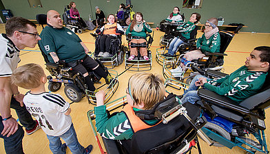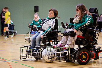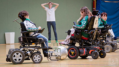 In der Sporthalle der Salvador Allende Grundschule in Rheinsberg liegt eine besondere Atmosphäre in der Luft. Der erste HausRheinsberg Powersoccer Cup findet statt. Insgesamt acht E-Rollstuhlfahrerinnen und -fahrer – drei Feldspieler und ein Torwart pro Team – jagen mit ihren Sportgeräten über das Parkett. Die Reifen quietschen, gelegentlich ertönt ein lautes Scheppern, wenn zwei Spieler aneinandergeraten, und immer wieder prallt der übergroße Fußball mit einem satten Schmatzen von den Schutzgittern ab, die vor jeden Elektrorollstuhl montiert werden.