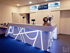 Zum Glück hatten unsere Techniker am Vorabend sämtliches Equipment und die Sportrollstühle direkt in die Sporthalle gebracht. Alle Batterien der Rollstühle wurden nochmals vorsorglich geladen, um im entscheidenden Spielmoment genug Power zu haben. Für den Transport der Rollis und Utensilien bedanken wir uns herzlich bei Herrn Saegeling der Firma Saegeling Medizintechnik Service‐ und Vertriebs GmbH, der uns freundlicherweise einen Transporter mit Hebebühne zur Verfügung stellte. Somit konnte alles unkompliziert transportiert werden und wir unsere Kosten minimieren. Gerne wieder!